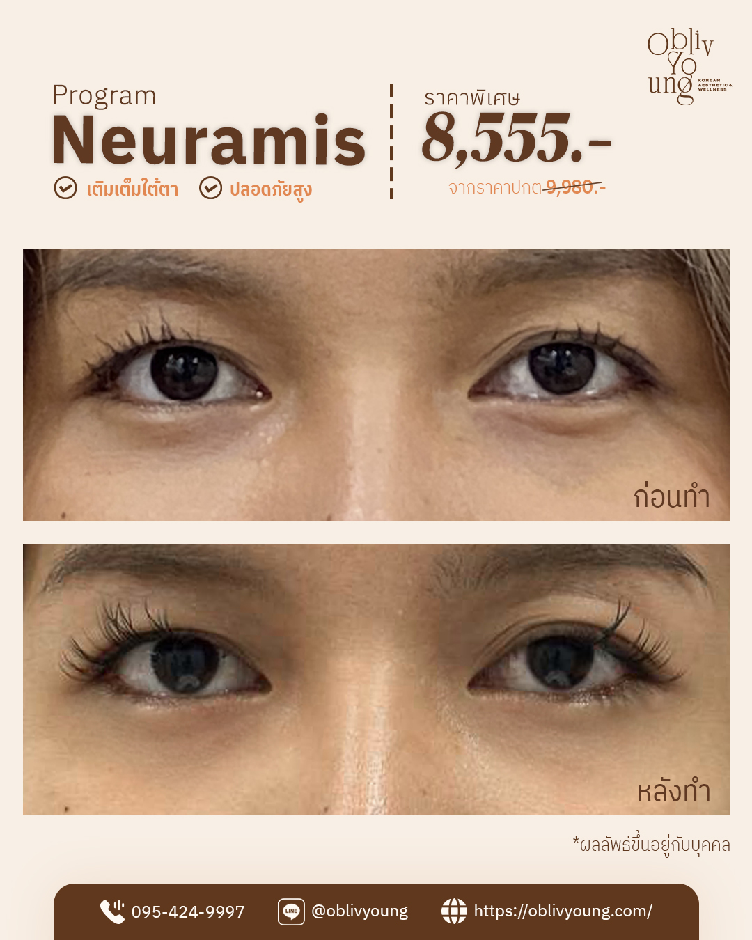เมื่อเทียบกับฟิลเลอร์ยุโรปอย่าง Juvederm หรือ Restylane จุดแข็งของ Neuramis คือความคุ้มค่า เห็นการเปลี่ยนแปลงทันทีหลังทำ และมีเท็กซ์เจอร์ที่กลืนผิวได้ดีในหลายตำแหน่ง ขณะที่อายุอยู่โดยเฉลี่ยจะสั้นกว่ากลุ่มยุโรปเล็กน้อย สำหรับคนไข้ที่ต้องการปรับรูปหน้า เติมร่องลึกระดับปานกลางถึงมาก ให้กรอบหน้าคมขึ้น หรือเติมวอลลุ่มบริเวณกว้างในงบประมาณที่เป็นมิตร Neuramis เป็นตัวเลือกที่สมเหตุสมผล แต่ถ้าเป้าหมายคือความคงทนระยะยาวมาก ๆ หรือจุดที่ต้องการความละเอียดสูงเป็นพิเศษ เราอาจพิจารณาฟิลเลอร์ยุโรปรุ่นเฉพาะทางแทน สรุปคือเราจะไม่ยึดติดแบรนด์เดียว แต่เลือก “เครื่องมือที่ถูกต้องสำหรับปัญหานั้น ๆ” เพื่อให้ได้ผลลัพธ์ที่สวย ปลอดภัย และเป็นธรรมชาติที่สุดสำหรับคุณเสมอ