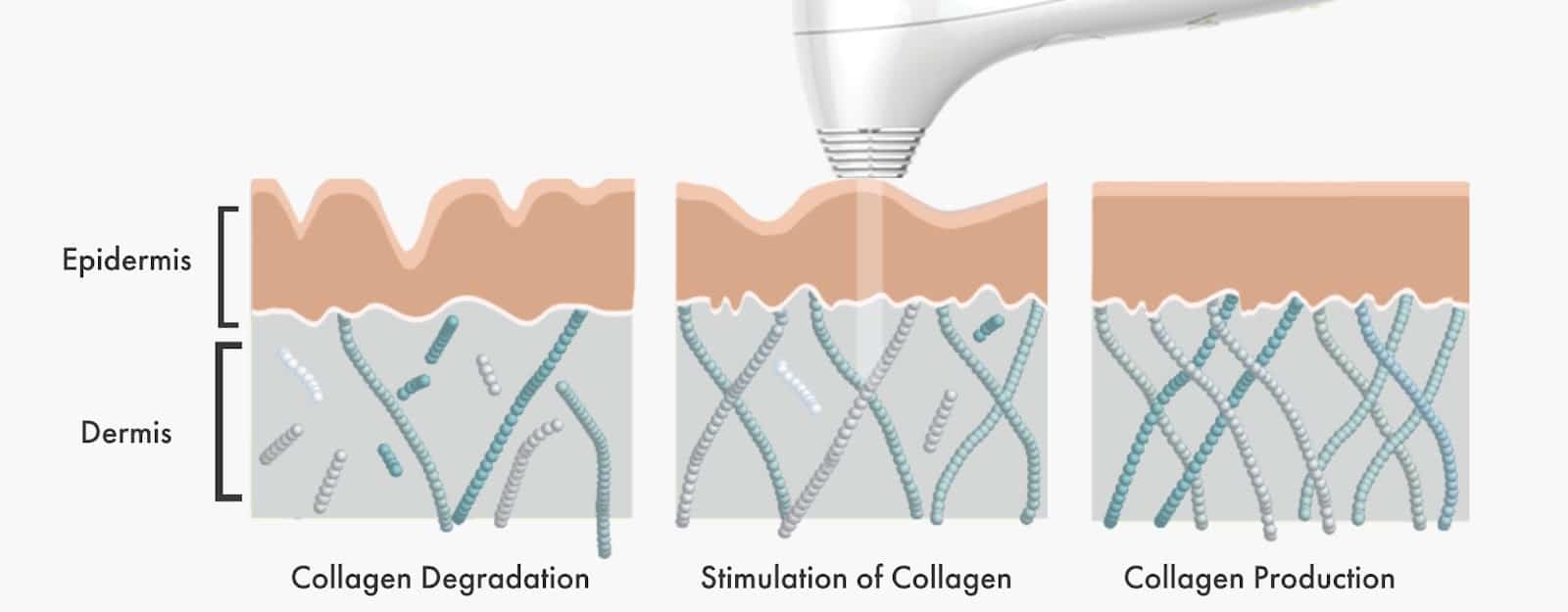 เครื่องยกกระชับทำงานผ่านกระบวนการปรับโครงสร้างผิว (tissue remodeling) โดยใช้พลังงานความร้อน (thermal energy) ลงไปในชั้นผิว เมื่อพลังงานลงถึงระดับที่เหมาะสม จะเกิดการกระตุ้นระดับจุลภาค (controlled injury) ทำให้เส้นใยคอลลาเจนหดตัวทันที (collagen contraction) และกระตุ้นการสร้างคอลลาเจนใหม่ (neocollagenesis) ในช่วง 1 ถึง 3 เดือน ส่งผลให้ผิวแน่นขึ้นและยกขึ้นในระยะยาว