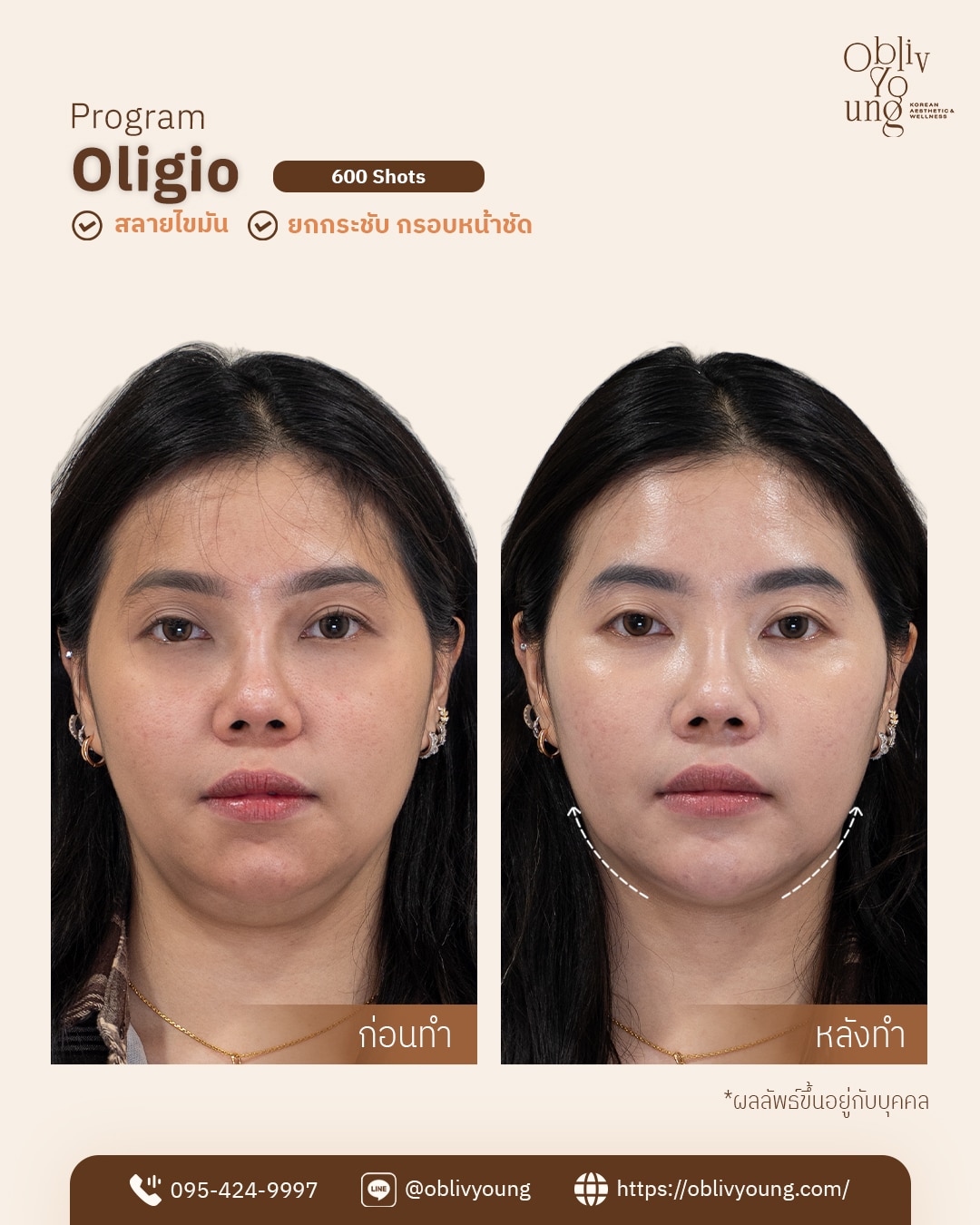 Oligio จะส่งพลังงาน RF ลงลึกถึงชั้นหนังแท้และชั้นไขมันใต้ผิว ช่วยให้เส้นใยคอลลาเจนหดตัวในทันที และกระตุ้นให้ร่างกายสร้างคอลลาเจนและอีลาสตินใหม่อย่างต่อเนื่อง ส่งผลให้ผิวค่อยๆ แน่น ฟู และเต่งตึงขึ้น ขณะเดียวกันพลังงาน RF ยังช่วย สลายไขมันสะสมบริเวณแก้ม เหนียง และกรอบหน้า ทำให้ใบหน้าดูเรียวกระชับโดยไม่ต้องผ่าตัดหรือพักฟื้น